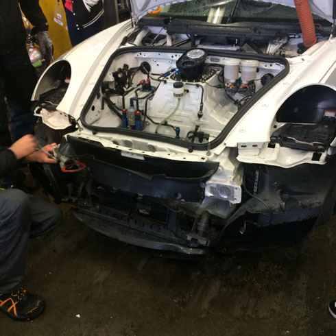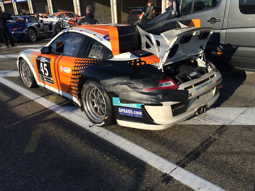 Leider konnte er den Porsche nicht halten und knallte rückwärts in die Leitplanke. Ein zusätzlicher Reparaturstopp war notwendig. Nach kurzer Standzeit und toller Arbeit vom Team konnte Jens das Rennen wieder aufnehmen. Leider nur kurz, denn an der gleichen Stelle brach der vordere Radträger, Folgeschaden aus dem vorherigen Unfall. Wieder war eine 20 minütige Reparaturpause erforderlich. Klaus und Miro übernahmen die beiden Schlussstints und konnten sich unter größtem Einsatz wieder einige Runden zurückrunden und trotzdem noch einen guten 6. Platz in unserer Klasse belegen.